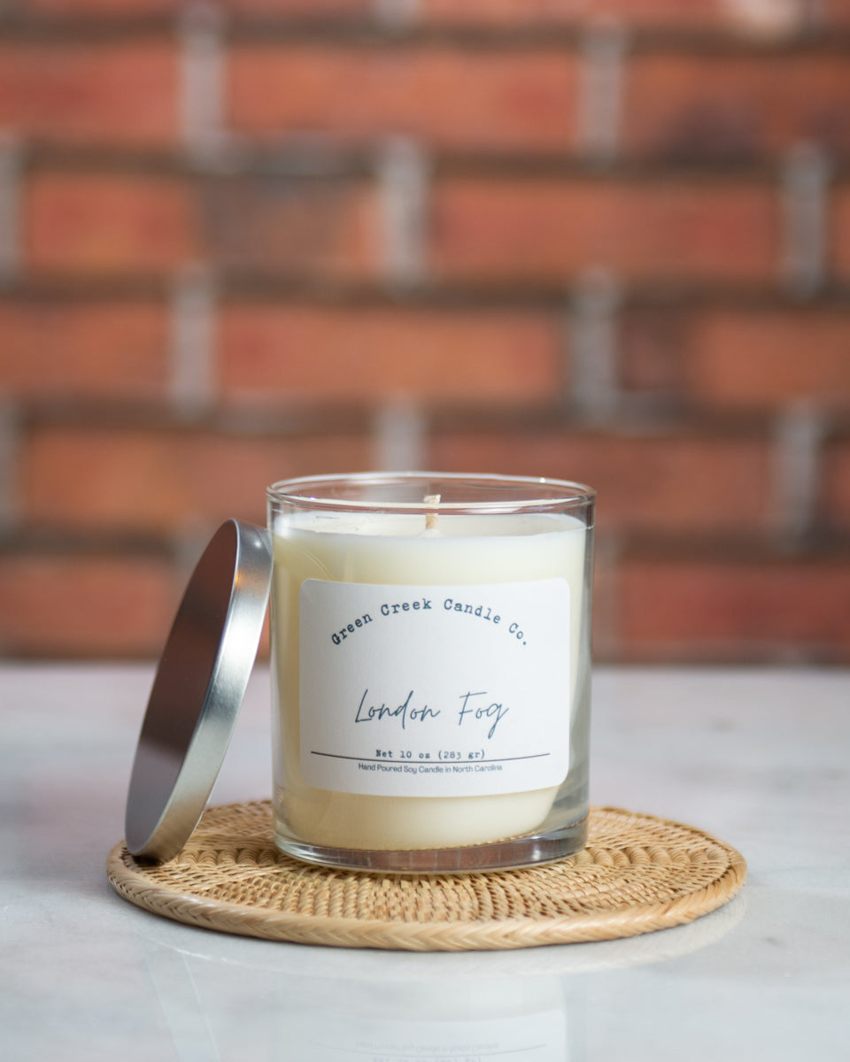 Embark on a sensory journey to the heart of London with our London Fog candle, a luxurious blend that evokes the essence of a classic London Fog latte. Infused with the rich aroma of Earl Grey tea, creamy vanilla, and a hint of soothing lavender, this fragrance envelops you in the cozy elegance of a charming café on a foggy London morning.